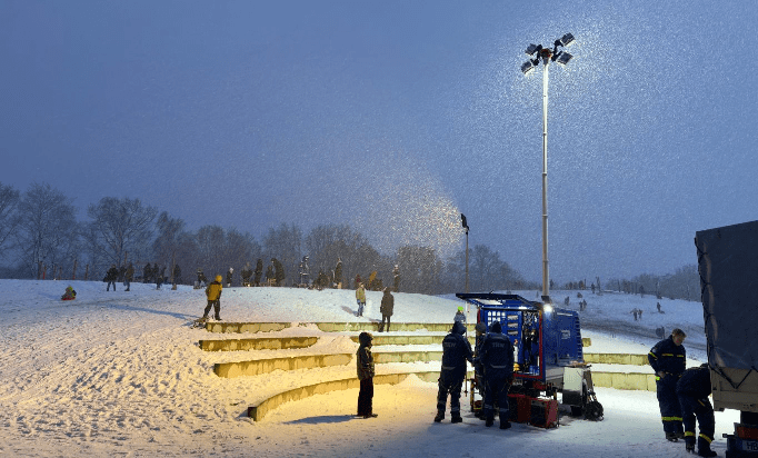 Netzersatzanlage mit Lichtmast ermöglicht Rodelspaß über den Einbruch der Dunkelheit hinaus.