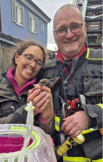 Ein kleines Eichhörnchen ist am Montag von der Feuerwehr gerettet worden. Zwei weitere Jungtiere waren bereits aus dem Kobel gefallen und hatten sich verletzt.