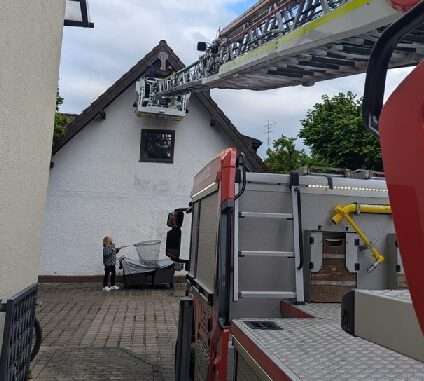 Um den Kobel sicher erreichen zu können, kam eine Drehleiter der Feuerwehr München zum Einsatz. Durch die beengten Platzverhältnisse an der Zufahrt zum Wohnhaus wurde dem Maschinisten der Drehleiter einiges abverlangt. Nachdem ein Brett am Giebel des Hauses entfernt worden war, konnte das verbliebene Eichhörnchen-Baby aus dem Kobel in Sicherheit gebracht werden. Als Dank wurde es von den beiden Helferinnen nach unserem Drehleiter-Maschinisten auf den Namen Fabi getauft. Der Verein Wildtierwaisenschutz e. V. übernimmt die Versorgung der kleinen Oachkatzl.