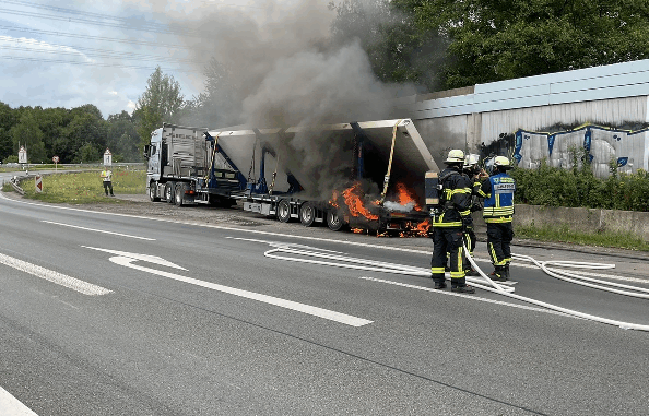 Beim Eintreffen der Einsatzkräfte hatte der Fahrer sein Gespann auf dem Seitenstreifen abgestellt und sich unverletzt in eine sichere Entfernung zum brennenden Fahrzeug begeben.