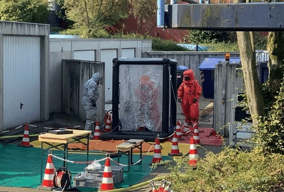 13.8.2025 – Am Vormittag kam es in einem öffentlichen Schwimmbad auf der Adenauerallee im Stadtteil Erle zu einem Austritt von Chlorgas. Beim Tausch von Chlorgasflaschen trat eine Undichtigkeit auf. Der Betreiber konnte die Undichtigkeit nicht eigenständig beheben und setzte umgehend über die 112 einen Notruf ab. Die Leitstelle der Feuerwehr alarmierte unter dem Einsatzstichwort „TH ABC-Land-2“ eine größere Anzahl an Einsatzkräften mit speziellen Gerätschaften und Einheiten für Gefahrstoffeinsätze. Vor Ort stellte sich heraus, dass ein Gasflaschenventil undicht war. Um die Gefahr sicher zu beseitigen, gingen die Einsatzkräfte unter Vollschutz in Chemikalienschutzanzügen (CSA) vor. Mit Spezialwerkzeug konnte die Undichtigkeit am Gasflaschenventil abgedichtet werden. Während des gesamten Einsatzes bestand zu keinem Zeitpunkt Gefahr für Badegäste oder umliegende Personen. Der Badebetrieb im übrigen Bereich konnte störungsfrei fortgesetzt werden. Nachdem die betroffene Chlorgasflasche erfolgreich gesichert war und Messungen keine Chlorgaskonzentration mehr ergaben, wurde die Einsatzstelle an den Betreiber übergeben. Die Feuerwehr war mit insgesamt 25 Einsatzkräften der Feuerwache 1 (Altstadt), 2 (Buer), 3 (Heßler) und des Löschzuges 12 der Freiwilligen Feuerwehr vor Ort.