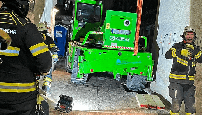 Am Einsatzort empfingen schon Mitarbeitende der Firma, die angerufen hatten, den Einsatzleiter. Sie wollten einen Teleskoplader zwischen zwei Häusern herausfahren, als an einem Hauseck plötzlich der Boden nachgab und das Gefährt stecken blieb. Dies war so nahe am Gebäude, dass ein weiteres Einsinken auch das Gebäude selbst in Mitleidenschaft gezogen hätte.