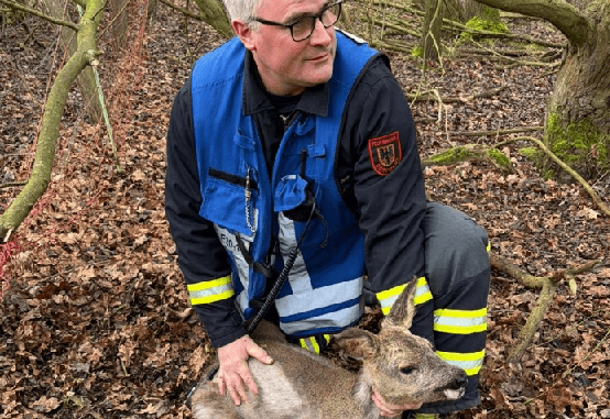 Vor Ort stellten die Feuerwehrleute fest, dass sich ein sehr junges Reh mit dem Kopf im Zaun verfangen hatte und nicht mehr in der Lage war, seinen Kopf aus dem Zaun heraus zu ziehen. Die Kollegen nahmen das Tier behutsam auf den Arm und schnitten die Maschen um den Kopf des Rehes auf, um das Tier schonend zu befreien.